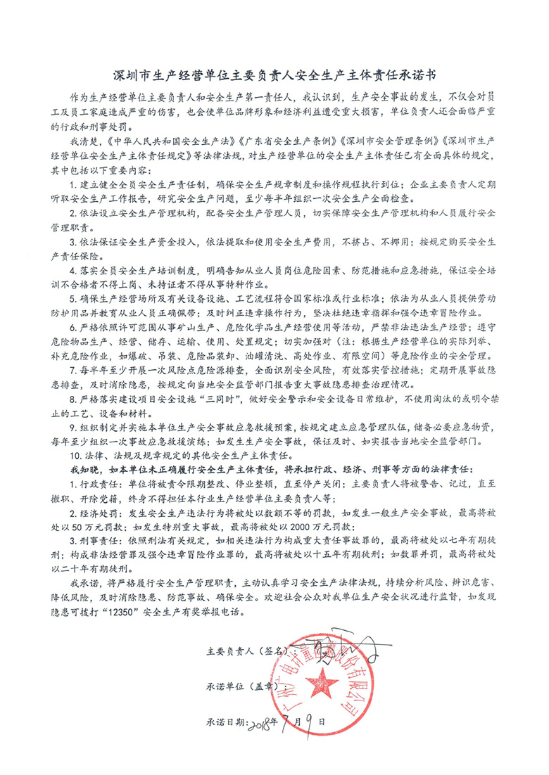 深圳市生产经营单位主要负责人安全生产主体责任承诺书