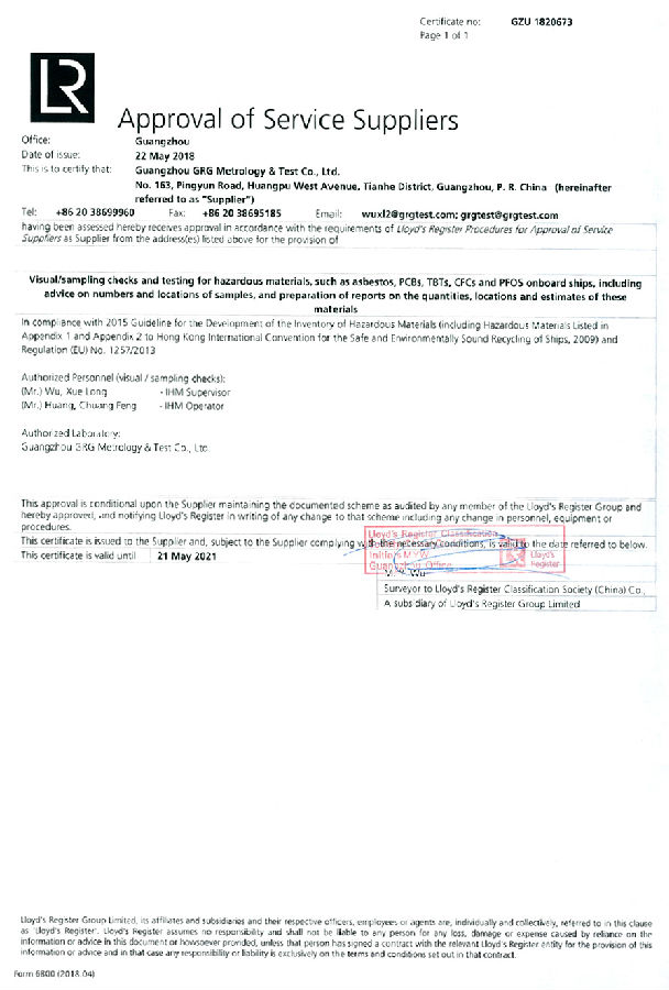 5月22日,广电计量通过一系列严格审核,顺利获得英国劳氏船级社授予的船舶有害物质取样及实验室检测机构认可证书。这是继获得中国船级社(CCS)及美国船级社(ABS)船舶有害物质检测机构认可之后,广电计量再度获得国际权威船级社认可。